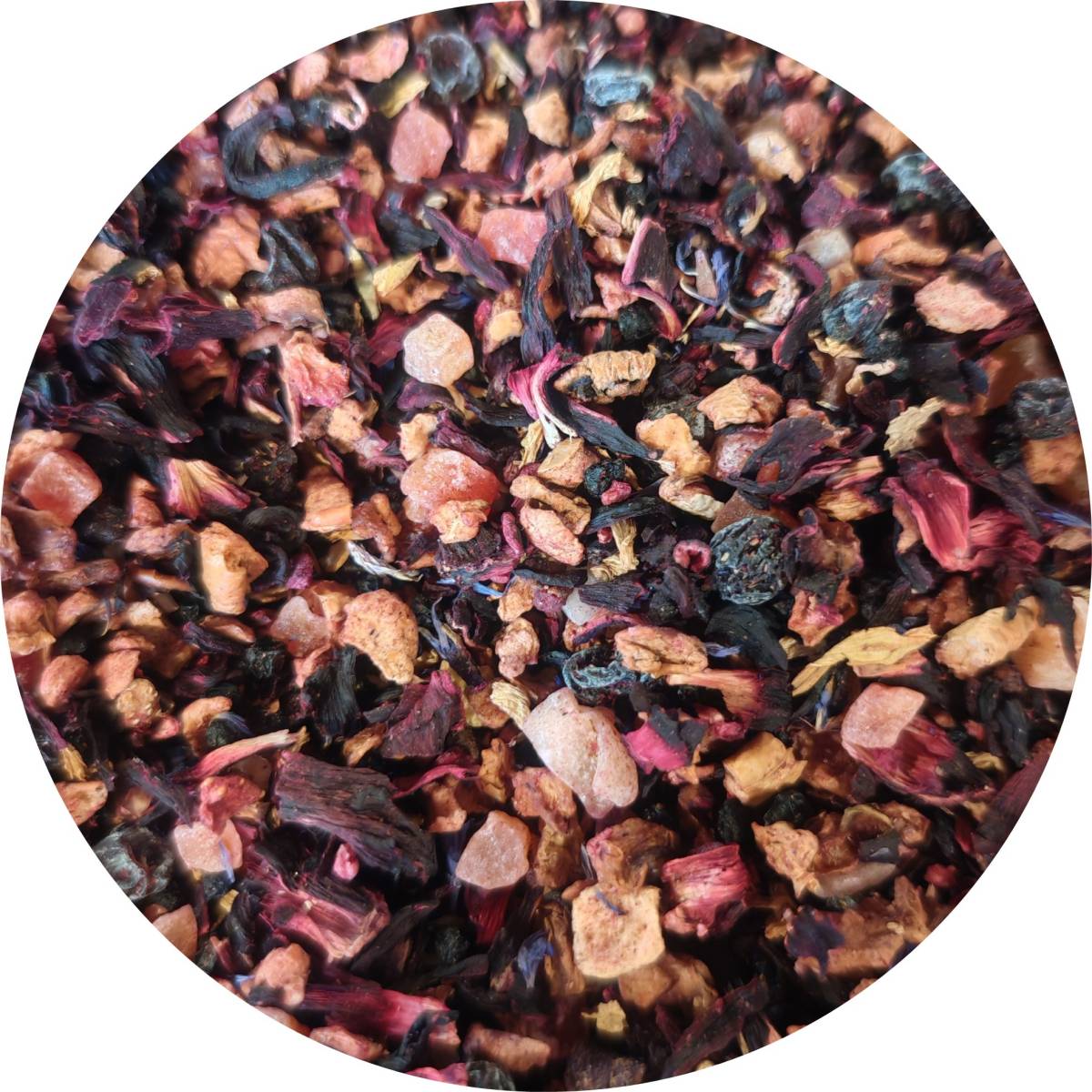 Infusion à l'hibiscus avec des morceaux de pomme, de papaye, raisin, sureau, cassis, fraise, framboise et pétales de tournesol et de bleuet. Un cocktail fruité et floral !