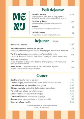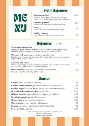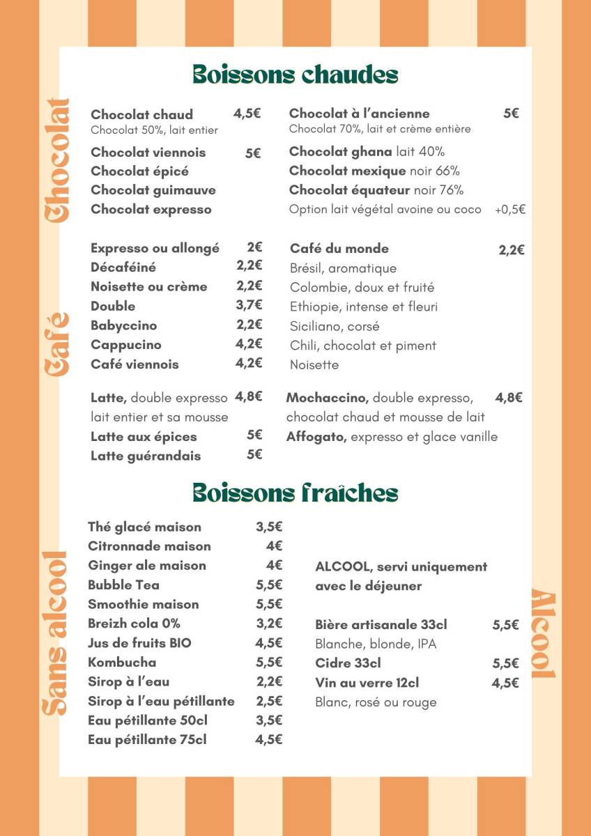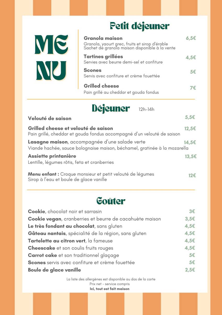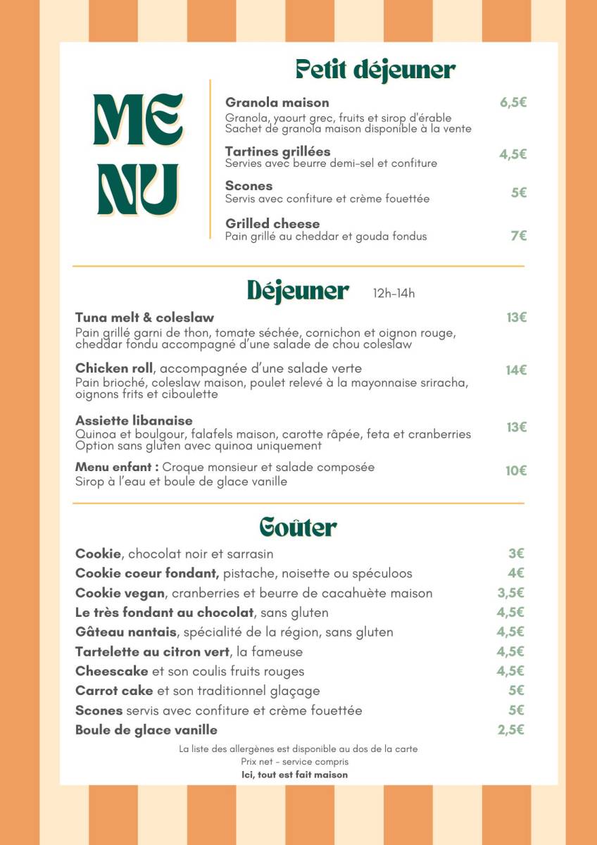 Vous trouverez également nos scones tout juste sortis du four, parfaits pour accompagner un thé ou un café, ainsi que le gâteau nantais, une spécialité régionale au bon goût de rhum et d’amande. Pour les amateurs de chocolat, notre fondant est un vrai moment de réconfort. Et bien sûr, le cheesecake, onctueux et généreux, vient compléter cette belle carte de douceurs artisanales.