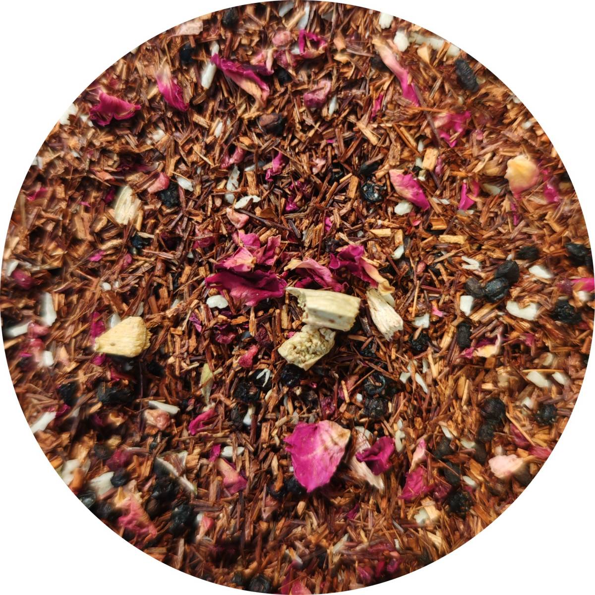 Rooïbos aux notes de rhubarbe, framboise, mûre, pétale de rose et éclat de noix de coco. Délicieux chaud et froid